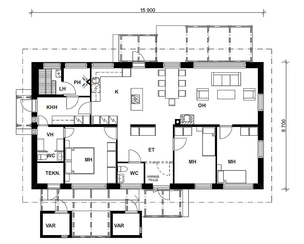 Muutoinkin asuinneliöt ovat tehokkaassa käytössä. Vaikka KS 115 on huoneistoalaltaan nykyomakotitaloksi pieni, se riittää hyvin kaksilapsisen, ehkä isommankin perheen asunnoksi.