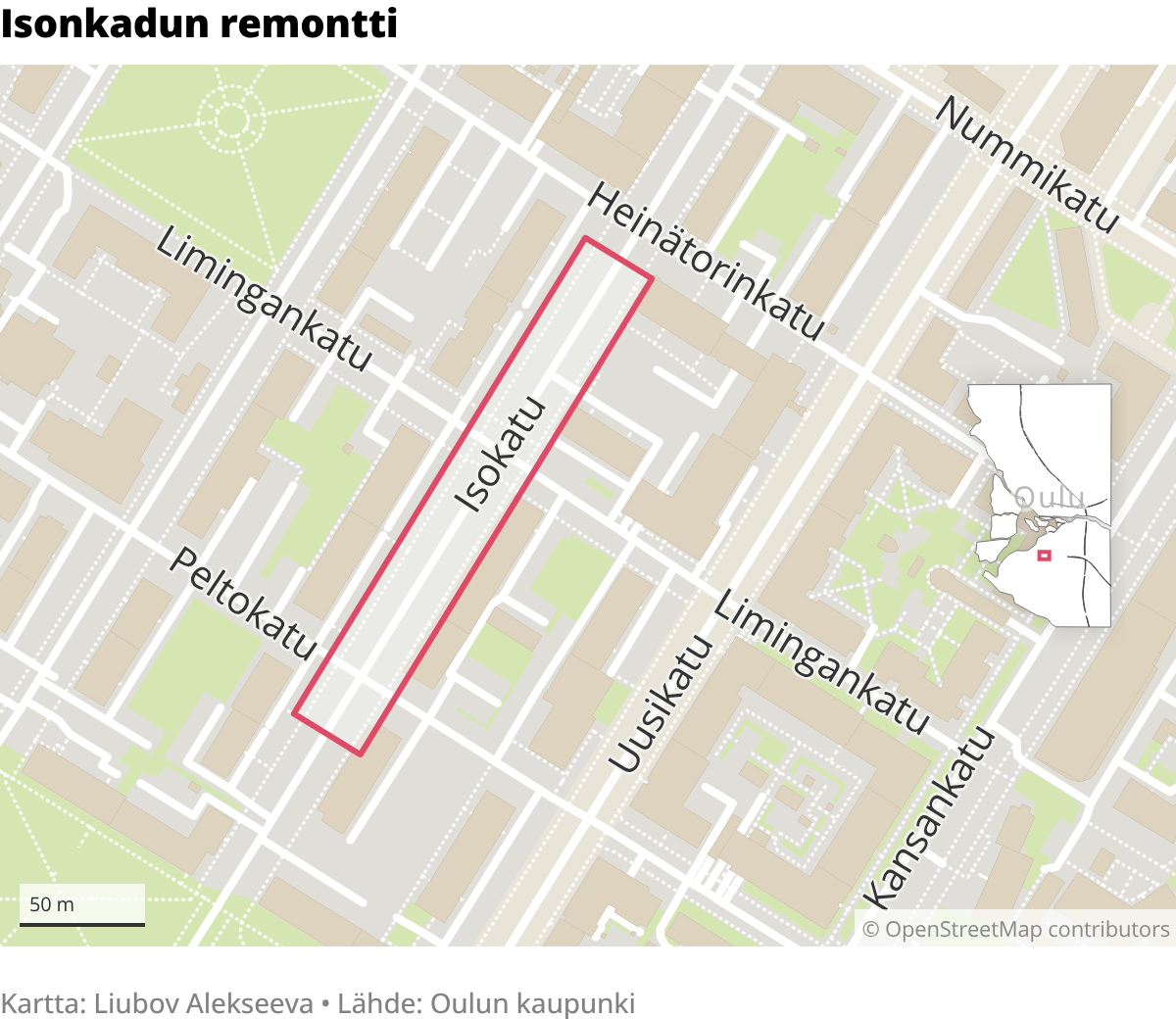 Oulun kaupunki toteaa tiedotteessa, että Isonkadun kunnallistekniikka on tullut käyttöikänsä päähän. Kaupungin vilkkaimpiin pääväyliin kuuluva katu on ollut pitkään peruskorjauksen tarpeessa.