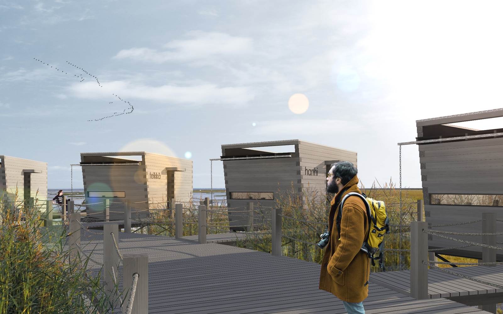 Luontokeskuksen ympäristöön ja riippusiltareitistön varrelle on suunniteltu merimökkikyliä, jotka toimivat luksustason majoituksena, mutta myös piilokojuina.