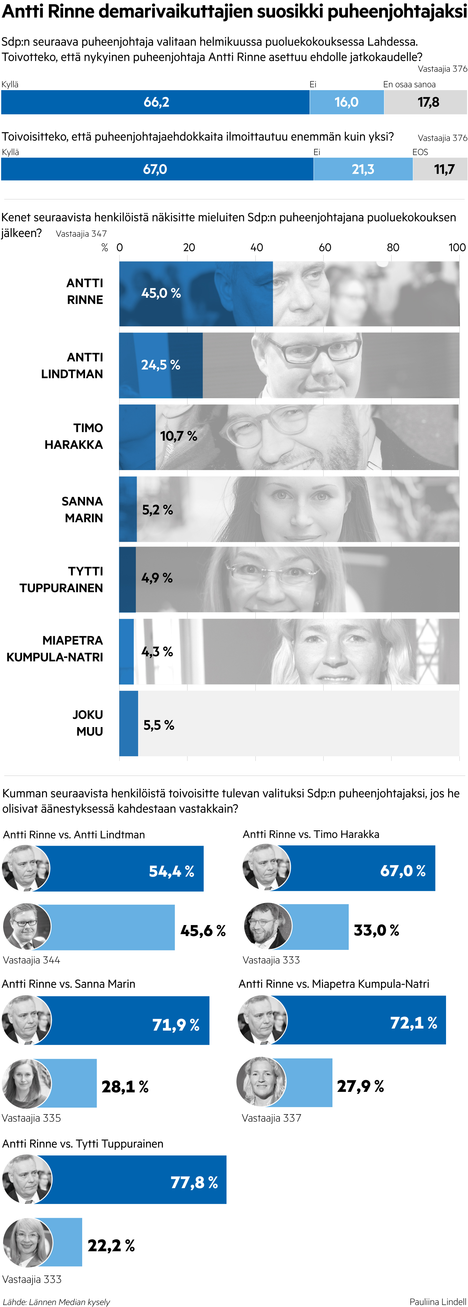 Demarivaikuttajat haluavat Rinteelle haastajan, mutta LM-kyselyssä vain Lindtman hengittää kaksintaistelussa potentiaalisella kirietäisyydellä Rinteestä. Istuva puheenjohtaja Rinne voittaa perintöprinssinään pidetyn Lindtmanin prosentein 54,4–45,6.
