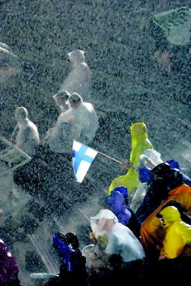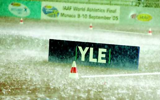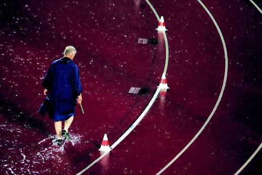 Rankkasade ja ukonilma keskeyttivät kisatapahtumat yleisurheilun MM-näyttämöllä Olympiastadionilla Helsingissä lähes kahden tunnin ajaksi. Helsinki oli sekaisin ukkosmyrskyn vuoksi. Keskustan pääväylät olivat tukossa.
