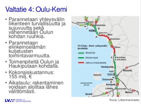 Hallitus sopi tiistai-iltana vuosien 2017-2020 julkisen talouden suunnitelmasta. Liikenne- ja viestintäministeri Anne Bernerin (kesk.) mukaan valtatie 4:n Oulun ja Kemin välisen osuuden rakentaminen voidaan aloittaa lähes välittömästi.