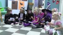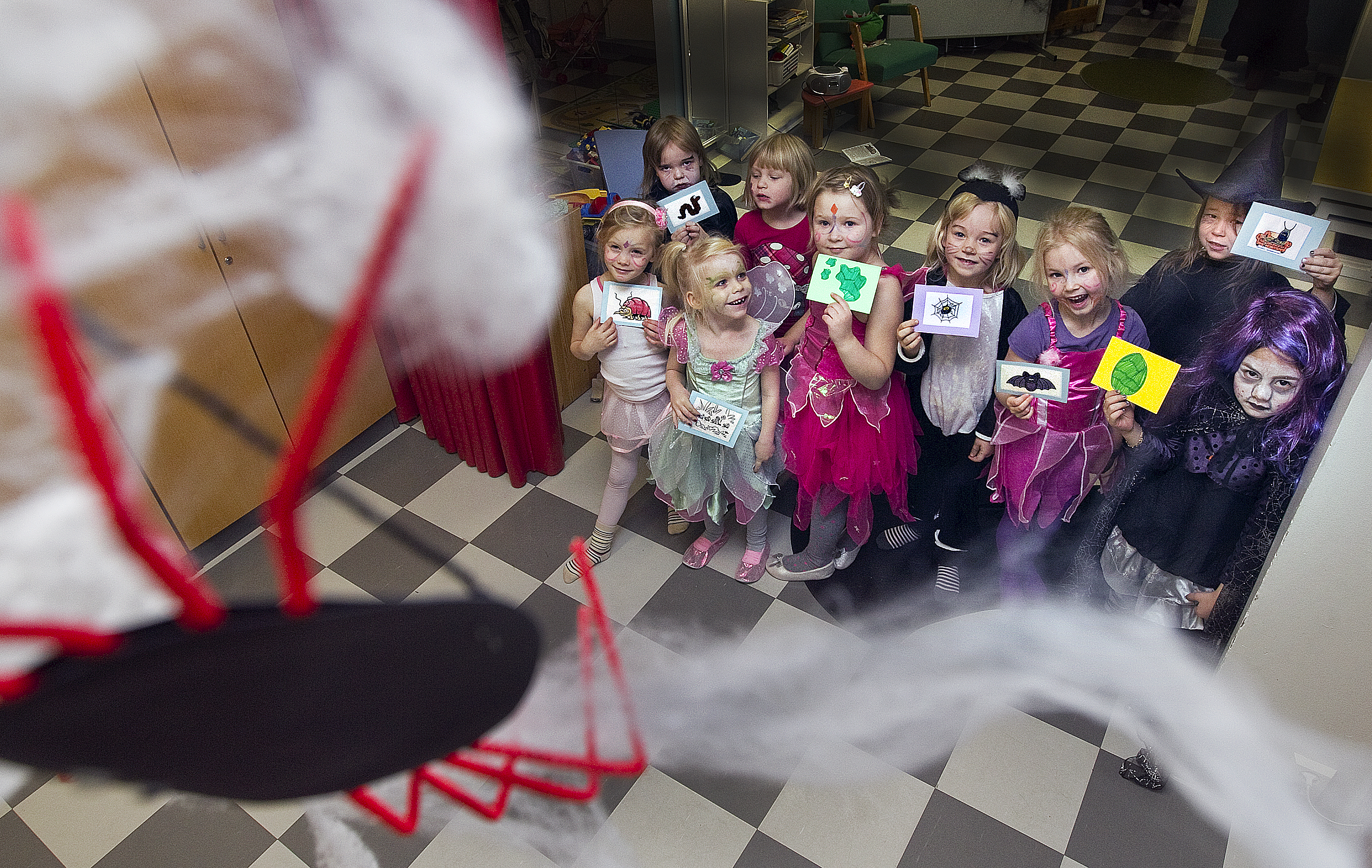 Halloween-rekvisiitan koristamassa päiväkodissa vietettiin kummitusjuhlaa, mutta aamupäivä kului vielä kenraaliharjoitusten merkeissä. Iltapäivällä vanhemmat pääsivät katsomaan englanninkielistä esitystä, jossa muun muassa keiteltiin noidan keittoa.