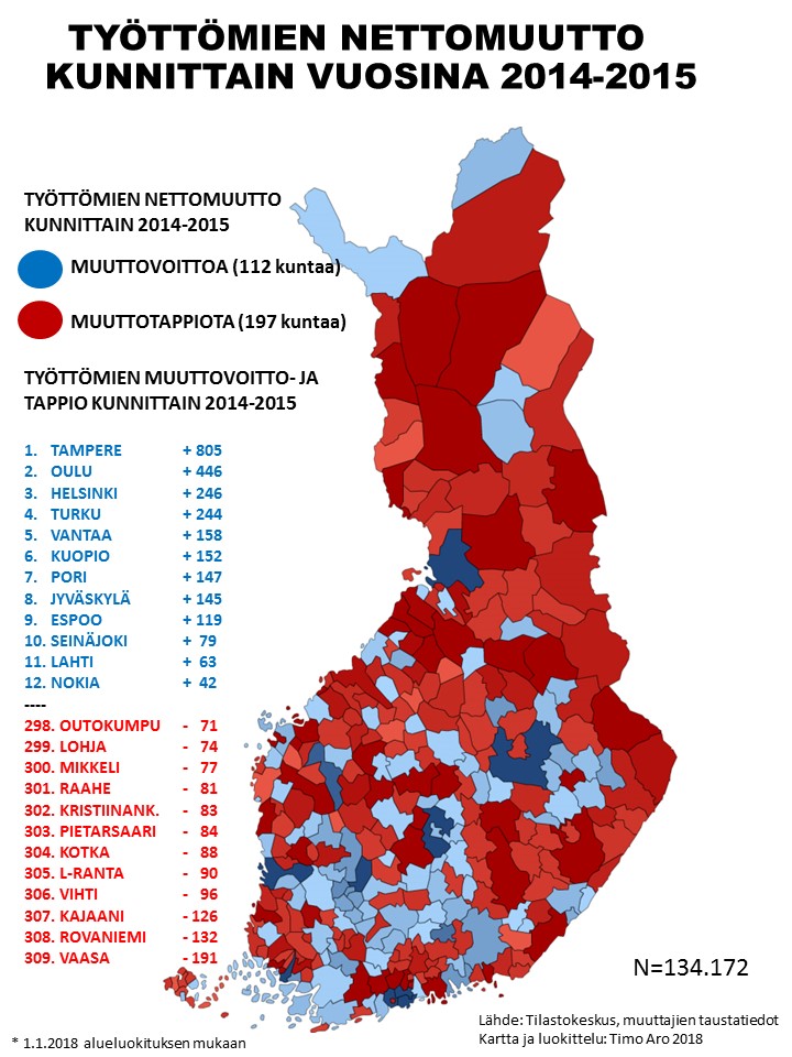 Tampere on vuosina 2014 ja 2015 jäänyt plussalle työttömien muuttovirroissa peräti 805 henkilön verran. Oulu on tilaston kakkonen 446 työttömän muuttovoitolla. Pääkaupunkiseudun kaupungit jäävät selvästi taakse. Esimerkiksi Helsinki on muuttovirrassa plussalla 246 työttömän verran.