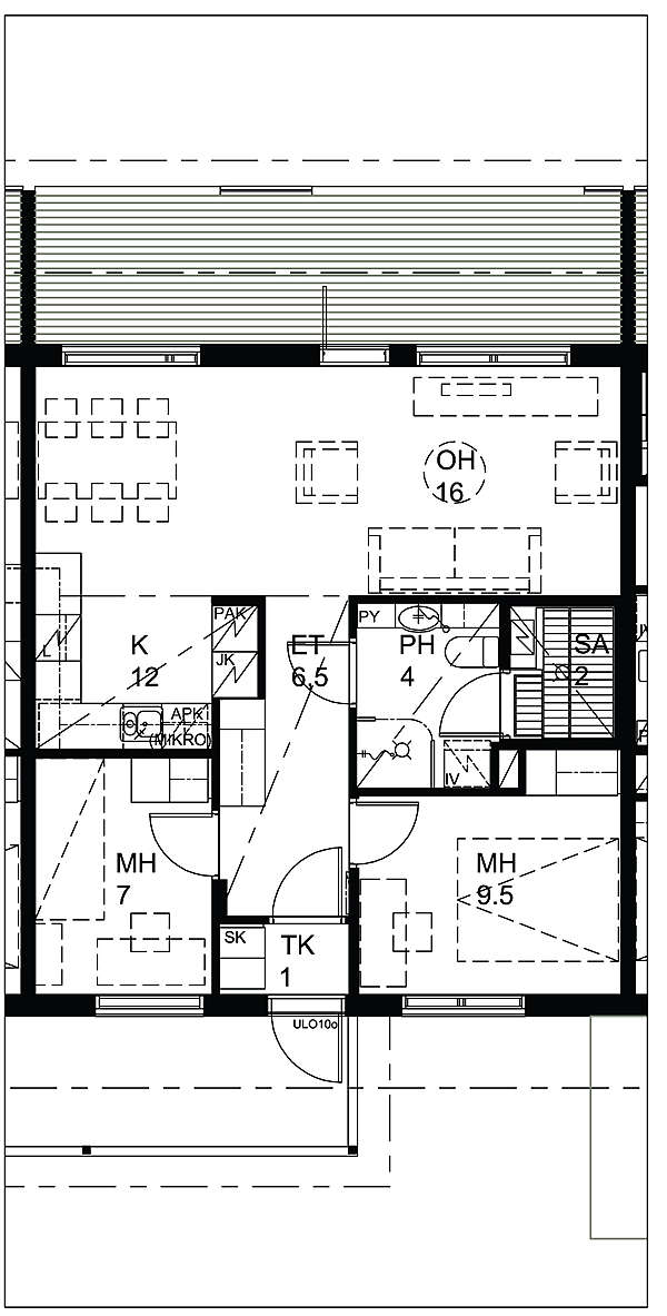 Asuntoa varjostaa ja viilentää suuri, asunnon levyinen parveke, jossa on umpiseinät ja katon harja laskeutuu sen ylle.