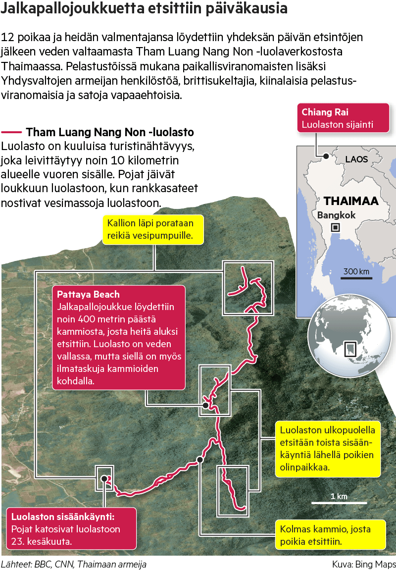 Thaimaassa huokaistiin maanantaina helpotuksesta, kun veden peittämään sokkeloiseen luolastoon yli viikko sitten kadonneet 13 poikaa löytyivät elossa.